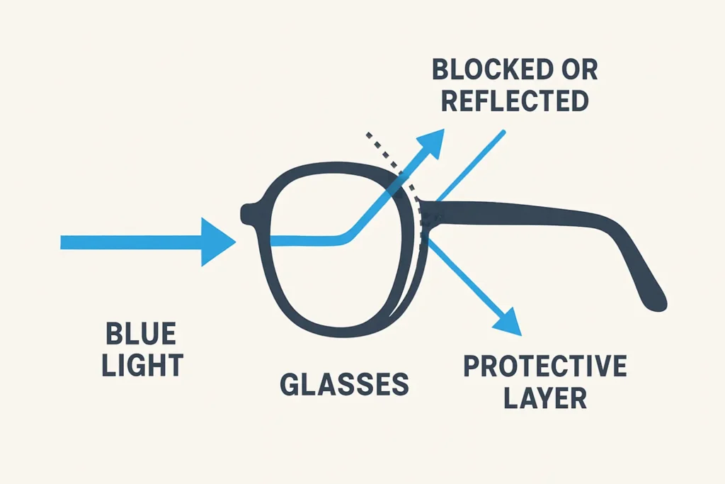 لنزهای عینک بلوکات با یک پوشش یا فیلتر مخصوص طراحی شدهاند که بخشی از نور آبی را مسدود یا جذب میکنند. این پوشش معمولاً روی سطح خارجی یا داخلی لنز یا گاهی در خود مواد سازنده لنز وجود دارد. میزان فیلتر کردن نور آبی در عینکهای مختلف میتواند متفاوت باشد. برخی عینکها بخش کوچکی از نور آبی را فیلتر میکنند و شفاف به نظر میرسند، در حالی که برخی دیگر مقدار بیشتری را فیلتر کرده و ممکن است کمی تهرنگ زرد یا نارنجی داشته باشند.